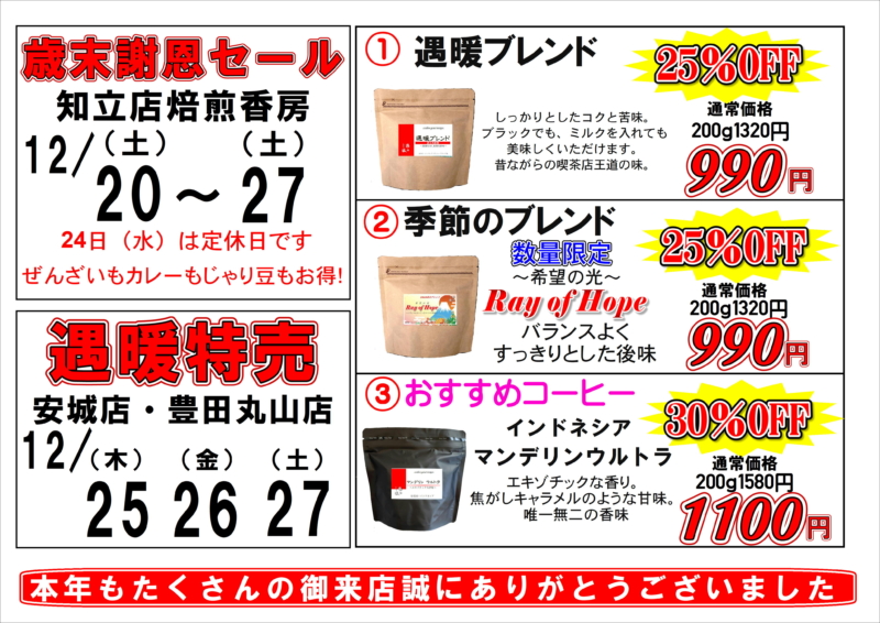 「珈琲遇暖・焙煎香房」特売日のご案内【12/25(木)-12/27(土)開催】